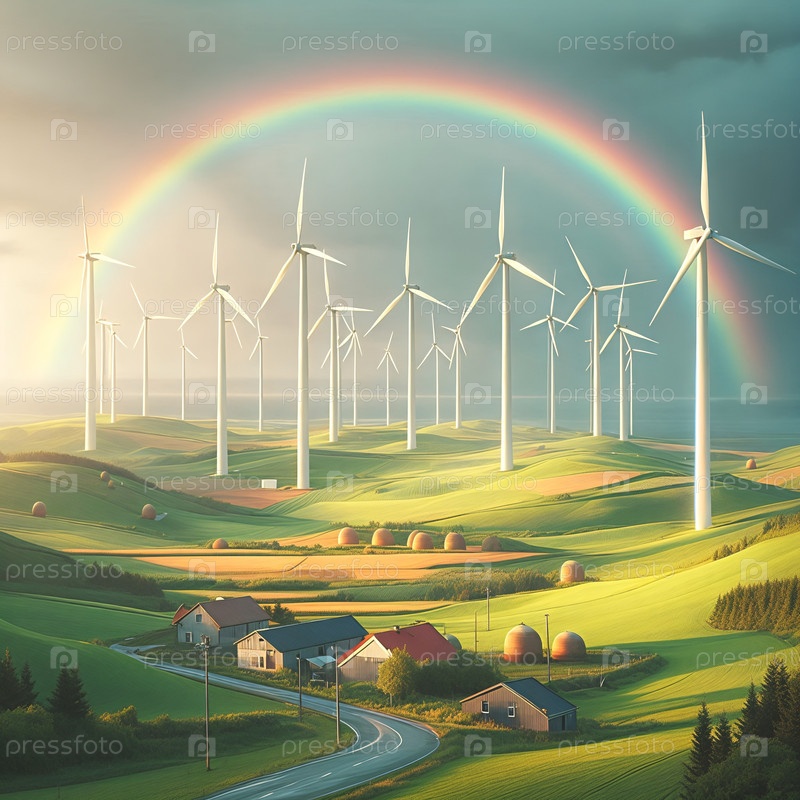 Ветряные турбины на зеленом поле с радугой в фоне, мирная атмосфера