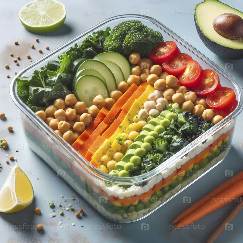 Стеклянная коробка для блюд со слойной чашей Будды: авокадо, горох и капуста, Ai created image