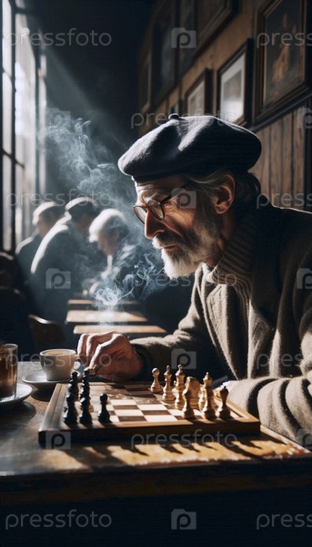 Пожилой мужчина играет в шахматы один в задымленном парижском кафе, документальный стиль, Ai generated image