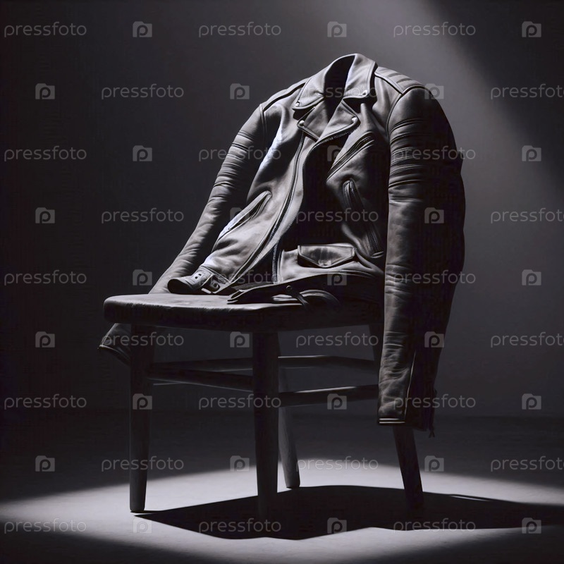 Простой, мощный натюрморт из изношенной кожаной куртки, заложенный на деревянном стуле и освещенный со стороны, Ай создал образ