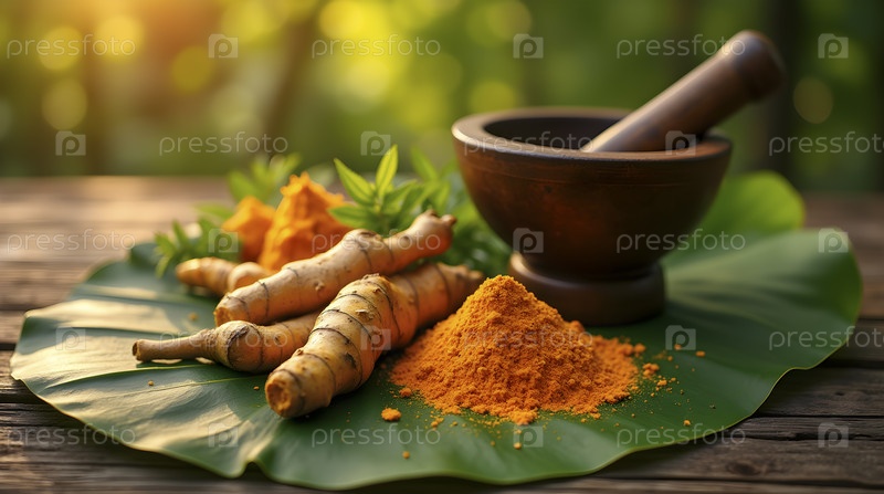 Свежие корни куркумы, ашваганда и листья брахми, изображение создано искусственным интеллектом