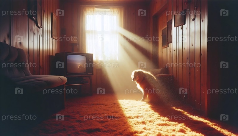 Семейная собака спокойно спит на солнечном квадрате на ковре в гостиной 1970-х годов, Ai generated image