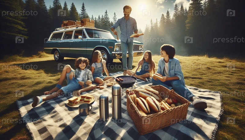 Веселый семейный пикник рядом со своим деревянным универсалом в национальном парке, Ai generated image