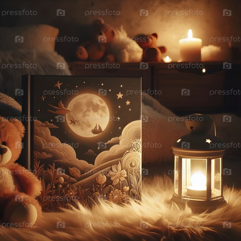 Книга сказок для сна в жесткой обложке на пушистом ковре, с ночным светом и плюшевым животным поблизости, Ай создал изображение