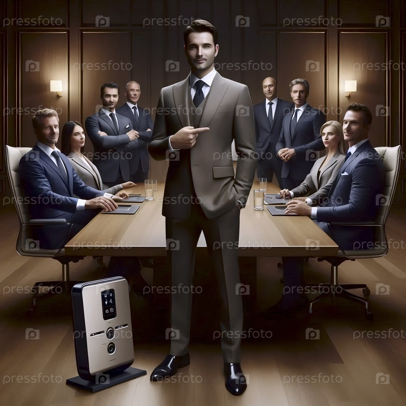 Уверенный бизнесмен в стройном костюме, демонстрирующий новую офисную диктантную машину с нажатием кнопки своим впечатленным коллегам, Ай создал образ