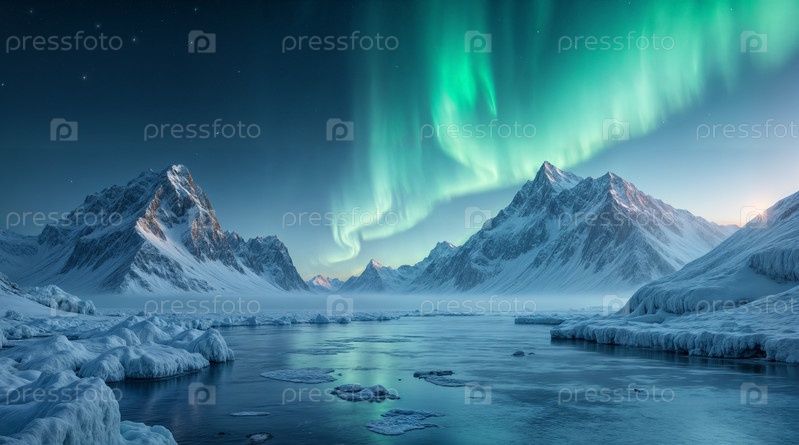 Снежные горы с полярными сияниями, изображение создано с помощью AI