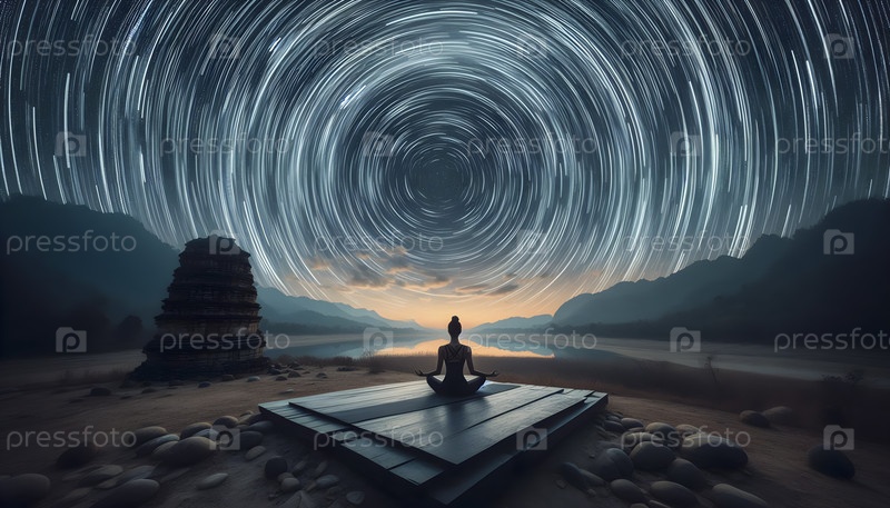 Time-lapse концепция звездных троп над пустынной платформой йоги, Ai created image