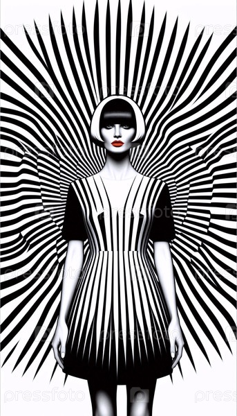Динамическая реклама моды Op-Art с моделью в модельном платье на фоне пульсирующих черно-белых концентрических кругов, Ai создала изображение