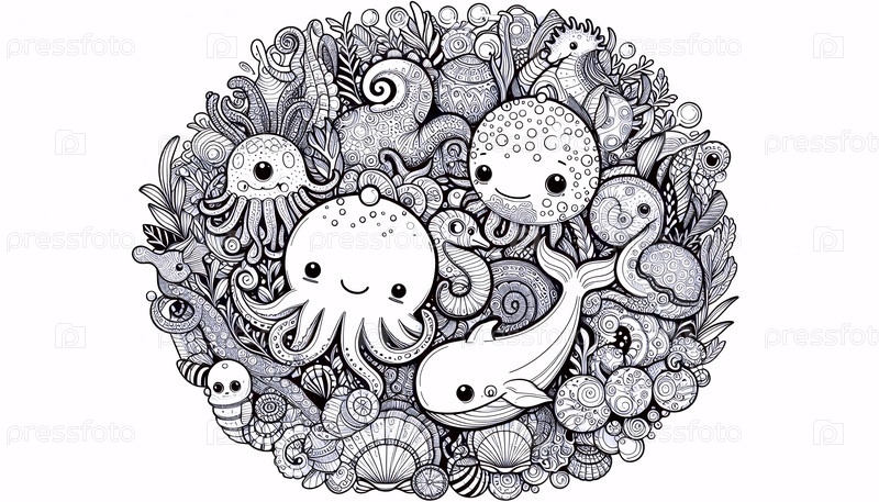 A kawaii ocean creatures цветная страница в круговом формате, Ai generated image