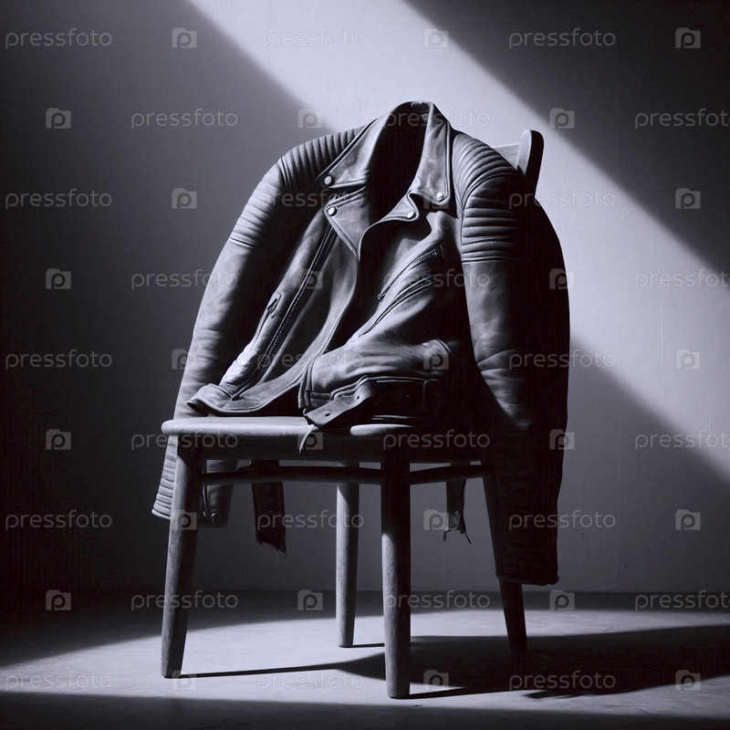 Простой, мощный натюрморт из изношенной кожаной куртки, заложенный на деревянном стуле и освещенный со стороны, Ай создал образ