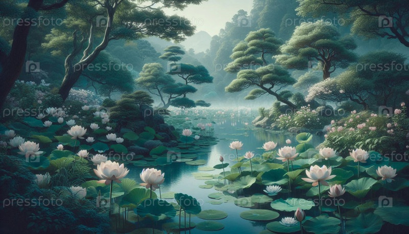 Устойчивый лотосный пруд в священном лесу, изображение создано искусственным интеллектом