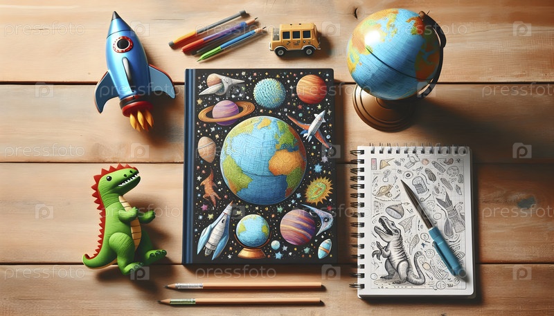 Детская книга с научной тематикой о космосе или динозаврах, размещенная рядом с мини-глобусом, Ai created image