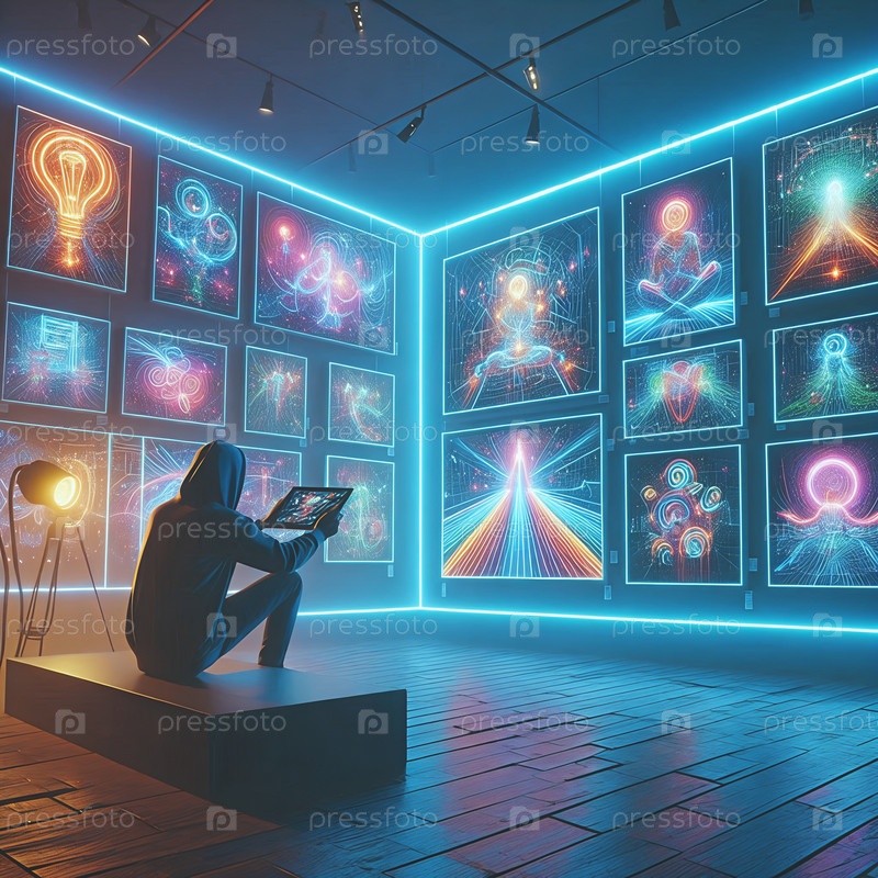 Художник демонстрирует цифровое искусство NFT в виртуальной галерее, неоновые огни