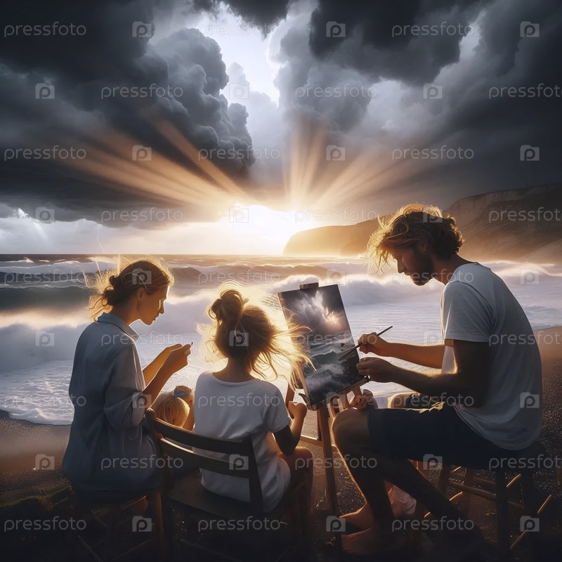 Молодая семья строит песчаный замок вместе на раздуваемом ветром пляже в конце бурного дня, драматическое просветление неба позади них