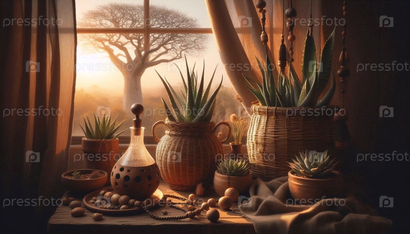 Интерьер в стиле бохо, стеклянные террариумы с воздушными растениями Tillandsia и увлажнителем, Ai generated image