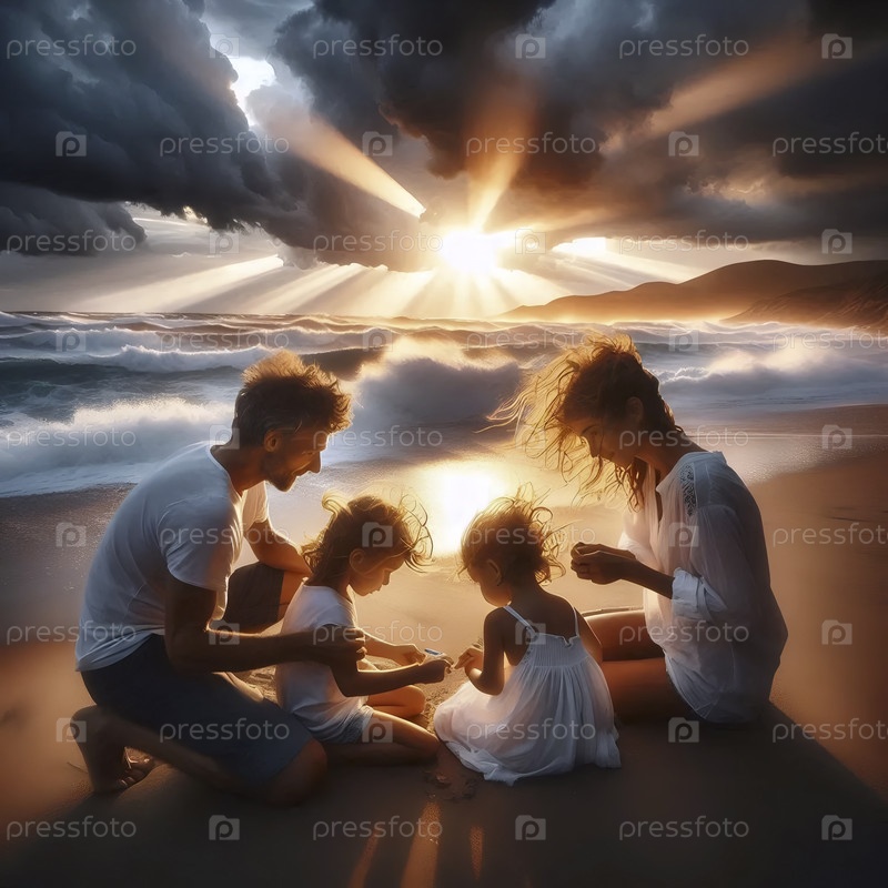 Молодая семья строит песчаный замок вместе на раздуваемом ветром пляже в конце бурного дня, драматическое просветление неба позади них