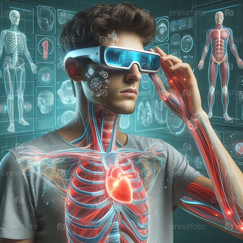 Студент, носящий очки AR, изучает анатомию с помощью 3D-холограмм, научно-фантастическая атмосфера