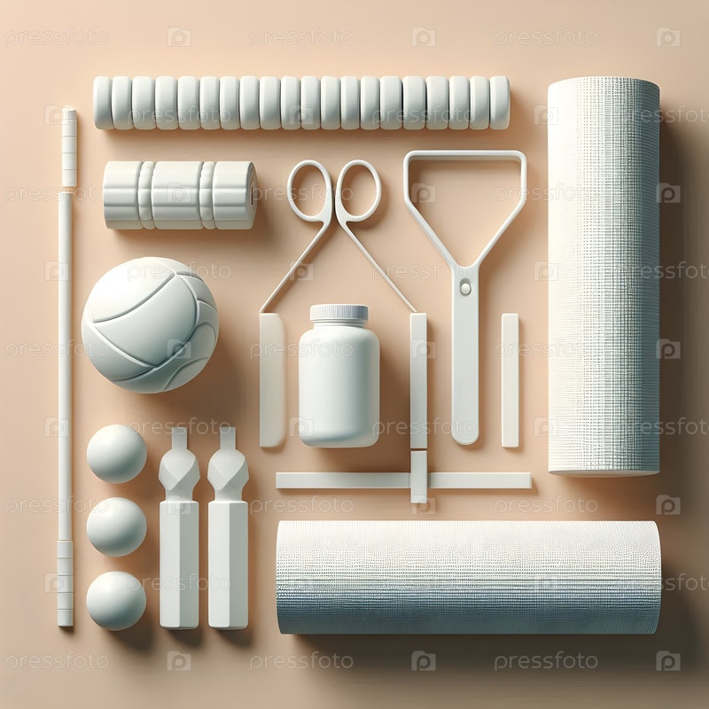 Минималистическое белое спортивное оборудование: резистентные полосы, матрас для йоги и ролик из пены, Ai created image