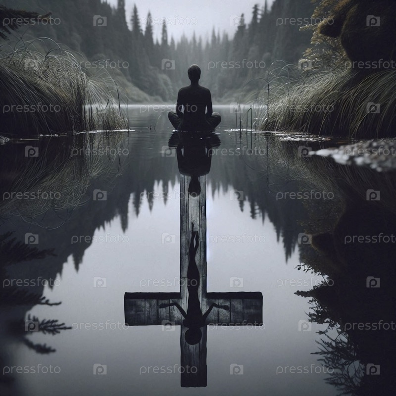 Отражение распятия в тихом озере с фигурой на берегу, Ай создал изображение