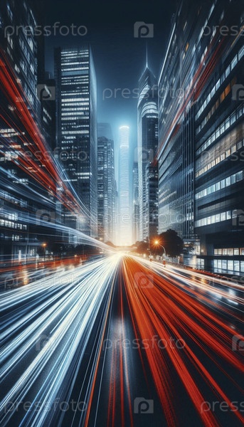 Долгая экспозиция световых путей автомобилей на влажном городском эстакаде ночью, с горизонтом, светящимся в фоне под капризным облачным небом, Ai создала изображение