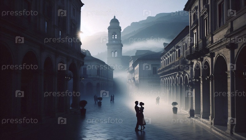Пара, медленно танцующая посреди асфальтированной площади в небольшом европейском городке, совершенно одна на рассвете, Ai создала изображение
