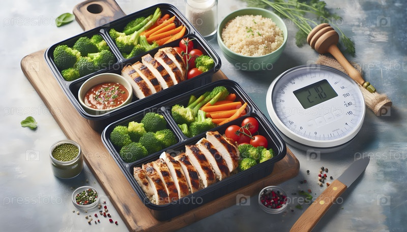 Вибрирующие контейнеры для подготовки фитнес-прогулок с жареным цыпленком, киноа и брокколи, Ai created image