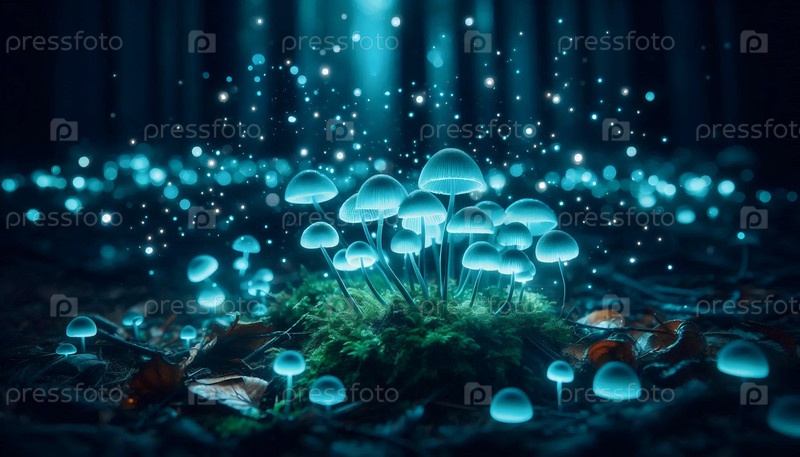 Светящийся биолюминесцентный кластер грибов, Ai generated image
