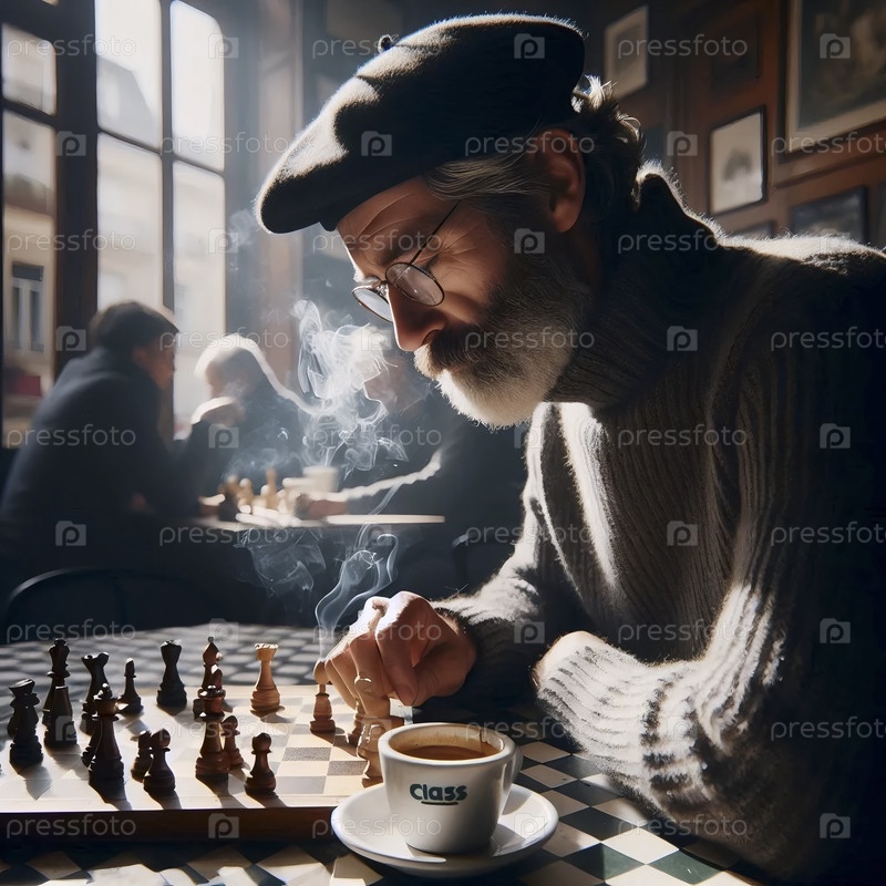 Пожилой мужчина играет в шахматы один в задымленном парижском кафе, документальный стиль, Ai generated image