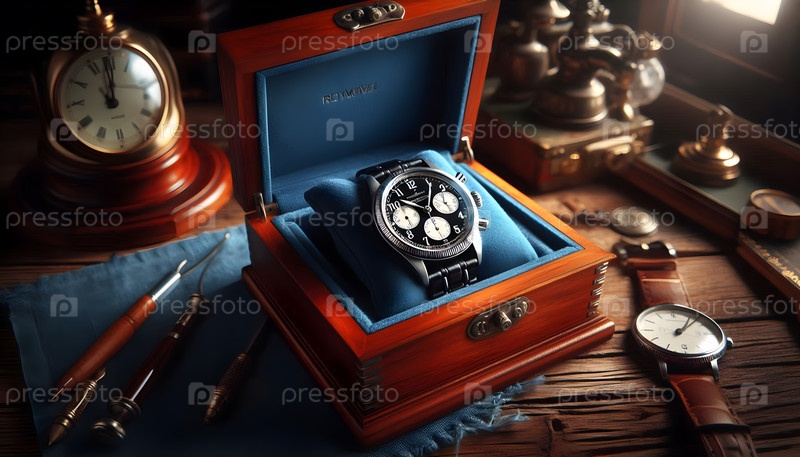 Швейцарские часы в деревянном витрине, изображение создано AI