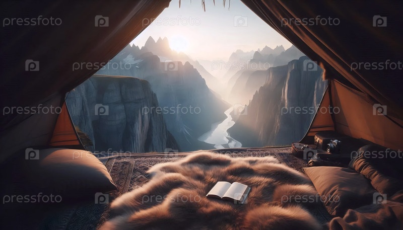 Палатка на вершине скалы с видом на горы, Ai generated image