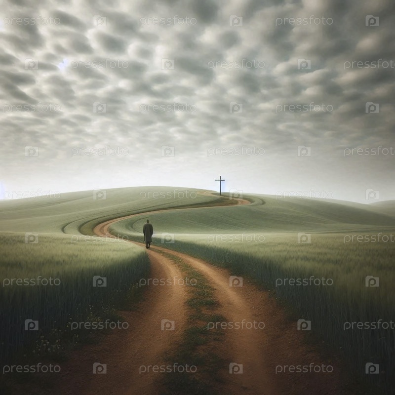 Человек, идущий в сторону по тропинке к далекому кресту на вершине холма, Ai generated image