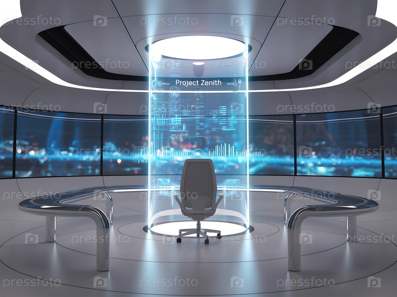 Футуристический офис, синий акцентный свет, изображение создано с использованием Ai