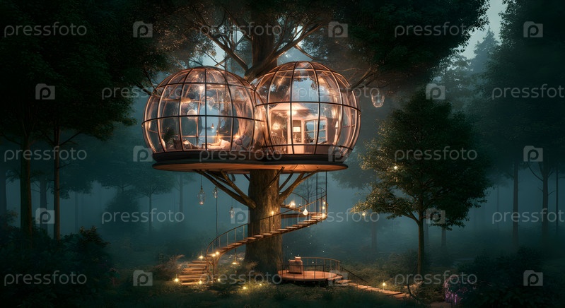 Стеклянный дом на дереве в лесу, изображение создано с помощью Ai