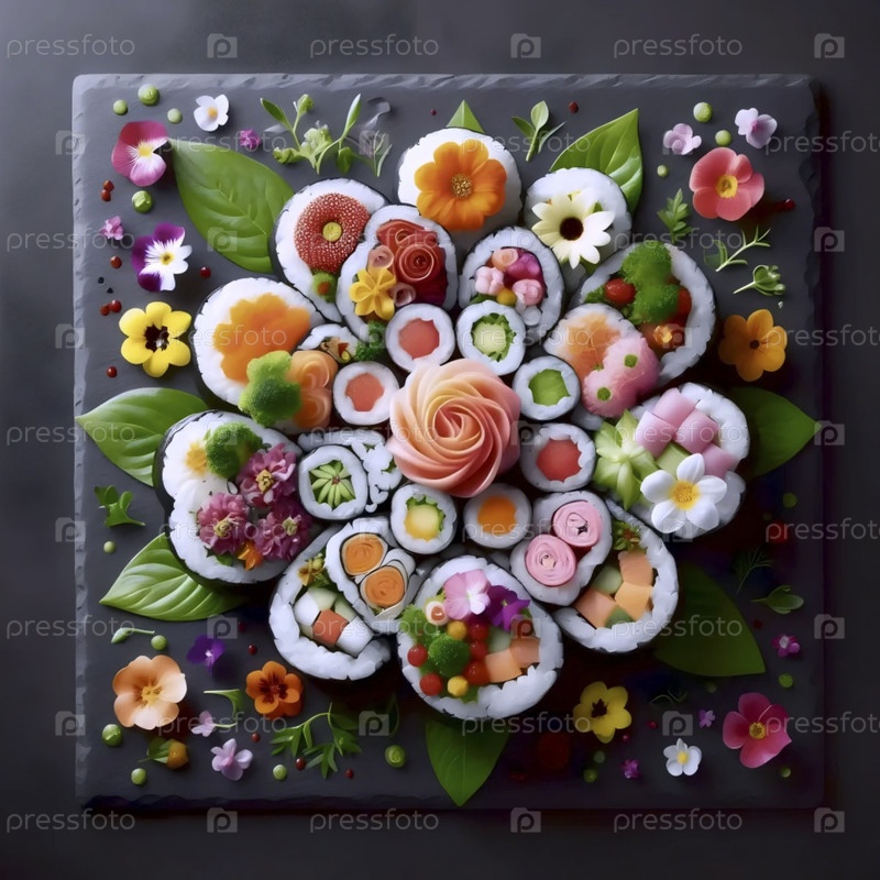 Творческие рулоны суши, расположенные таким образом, чтобы сформировать красочный цветочный рисунок на черном сланце, украшенный съедобными цветами и микрозеленью, Ai created image