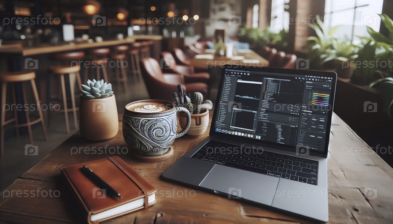 Искусство, ноутбук с чашкой кофе, Ai generated image Lat
