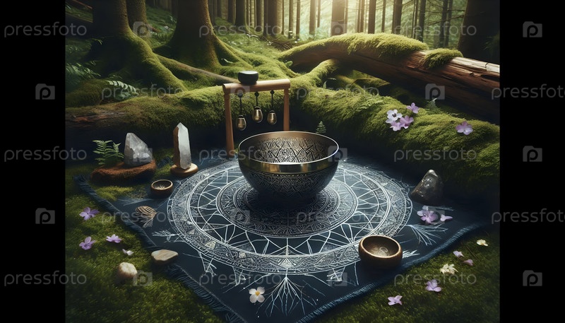Кристальная решетка и певческая чаша на йога-матке в моховом лесу, Ai created image