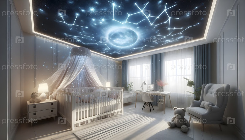 Детский сад с потолочными проекциями созвездий, реагирующих на дыхание ребенка, Ai created image