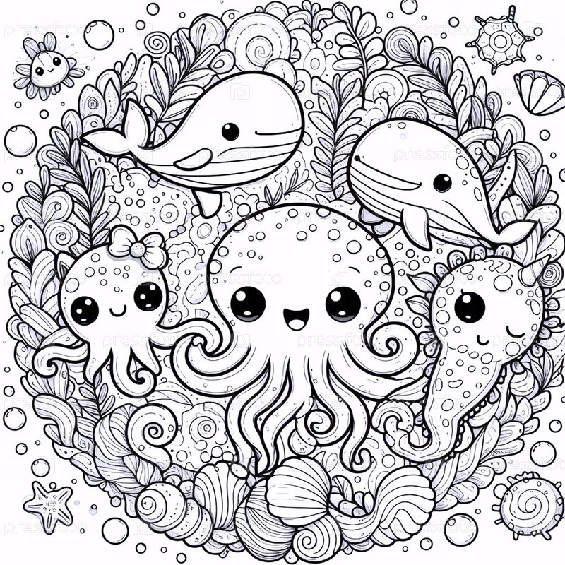 A kawaii ocean creatures цветная страница в круговом формате, Ai generated image