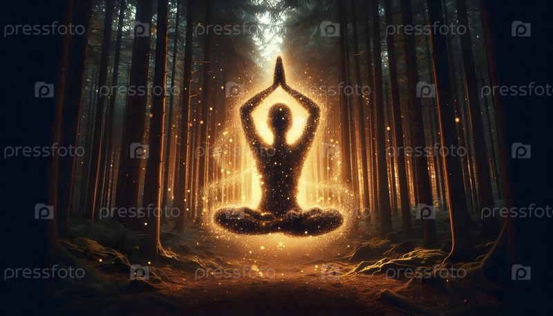 Плавучие позы йоги, сделанные из светящихся частиц в лесу при закате, Ai created image