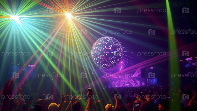 Сцена в ночном клубе с одним гигантским дискотечным шаром, отражающим красочные лазерные лучи во всех направлениях, Ai generated image