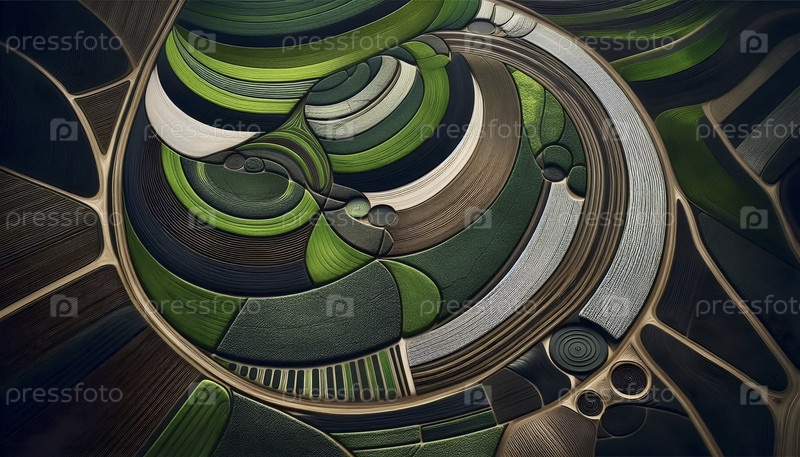 Вид с воздуха на плотное геометрическое сельскохозяйственное поле, образующее абстрактный рисунок линий и кривых, Ai generated image