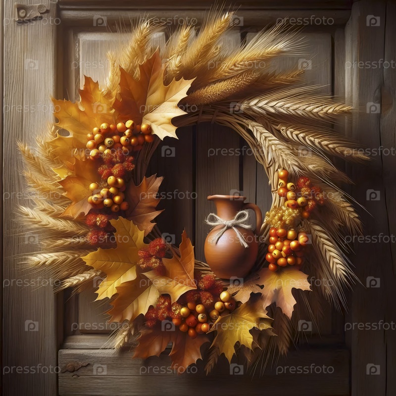 Венок из пшеницы и осенних листьев с миниатюрным глиняным кувшином, Ai generated image