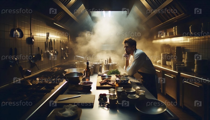 Шеф-повар в тихом, сфокусированном послеобеденном сервизе, убирающий станцию на кухне, освещенной только практическими рабочими огнями, Ай создал изображение
