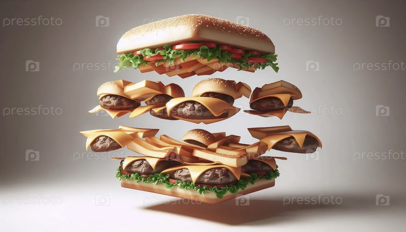 Пищевое искусство оптической иллюзии, показывающее невозможную структуру бургера с плавающими элементами, Ai created image
