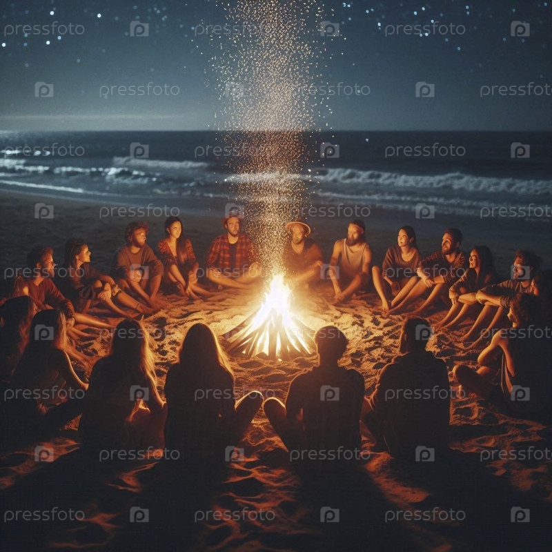 Группа друзей собралась вокруг трескающего костра на темном, отдаленном пляже, их лица были освещены пламенем под звездным небом