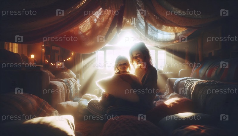 Семья, строящая разветвленную и сложную ковровую крепость в гостиной, захваченная изнутри форта, создала образ Ай