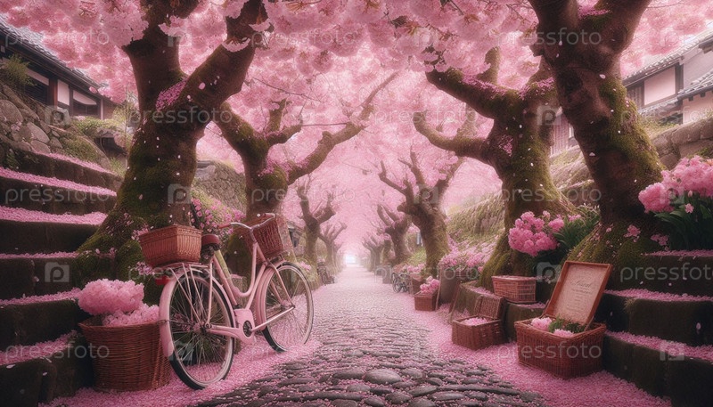 Весенний тоннель с винтажным велосипедом, Ai generated image
