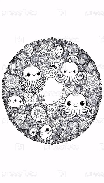 A kawaii ocean creatures цветная страница в круговом формате, Ai generated image