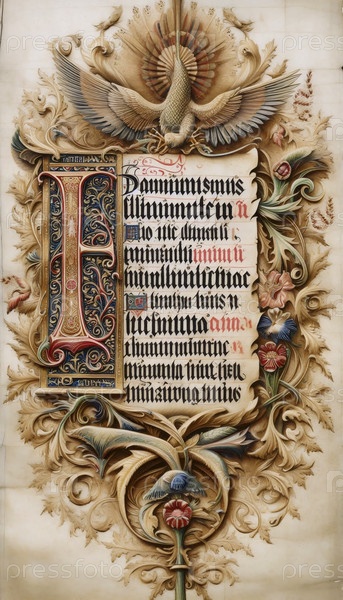 Фрагмент Псалма с иллюминацией из золотых листьев, Ai generated image