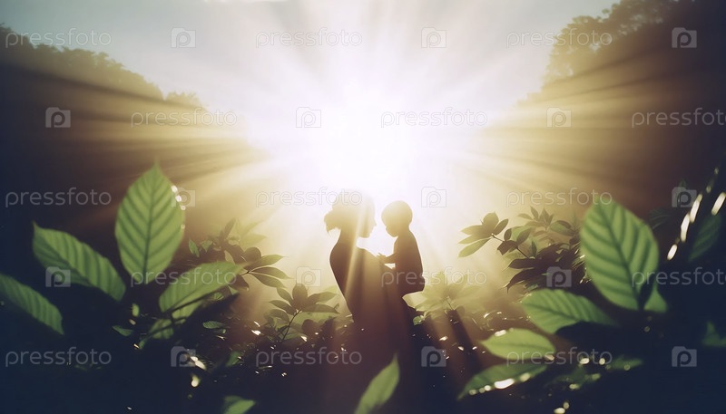 Родитель держит маленького ребенка, чтобы он прикоснулся к листьям большого дерева в парке, освещенном солнцем, Ай создал изображение